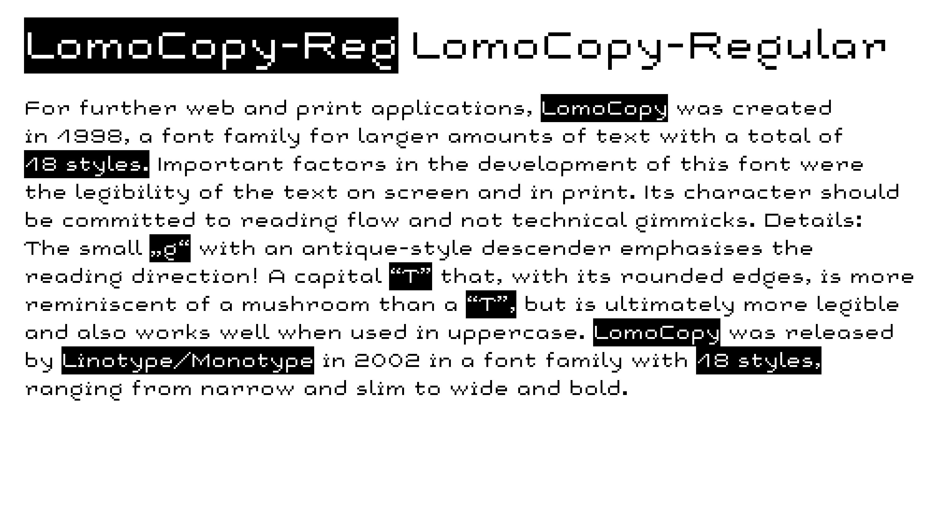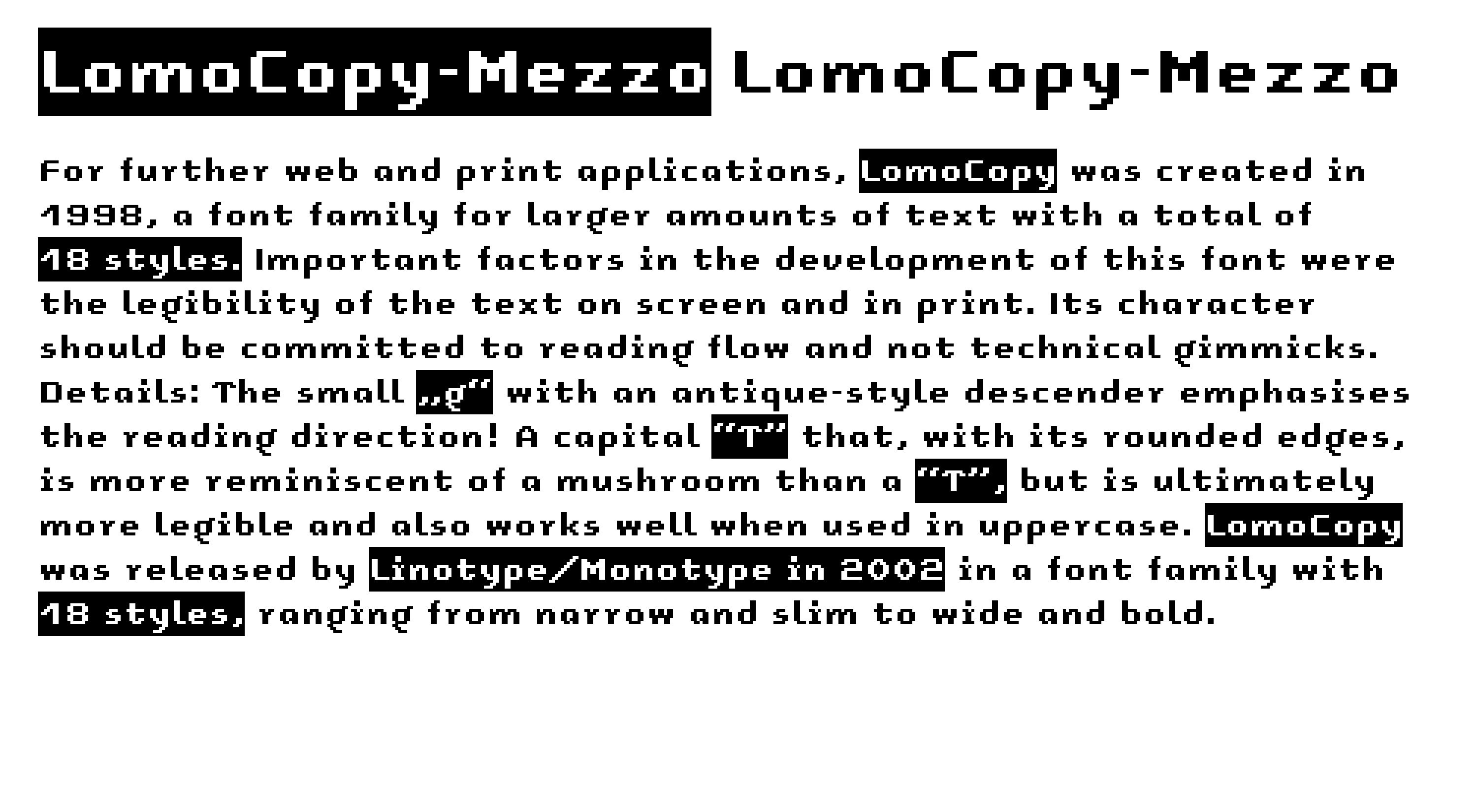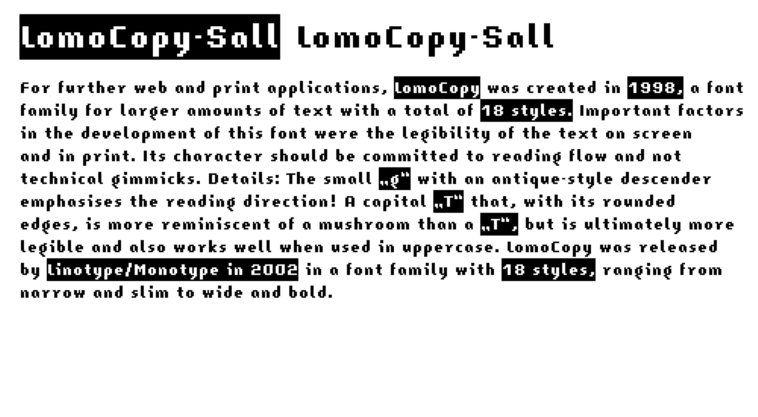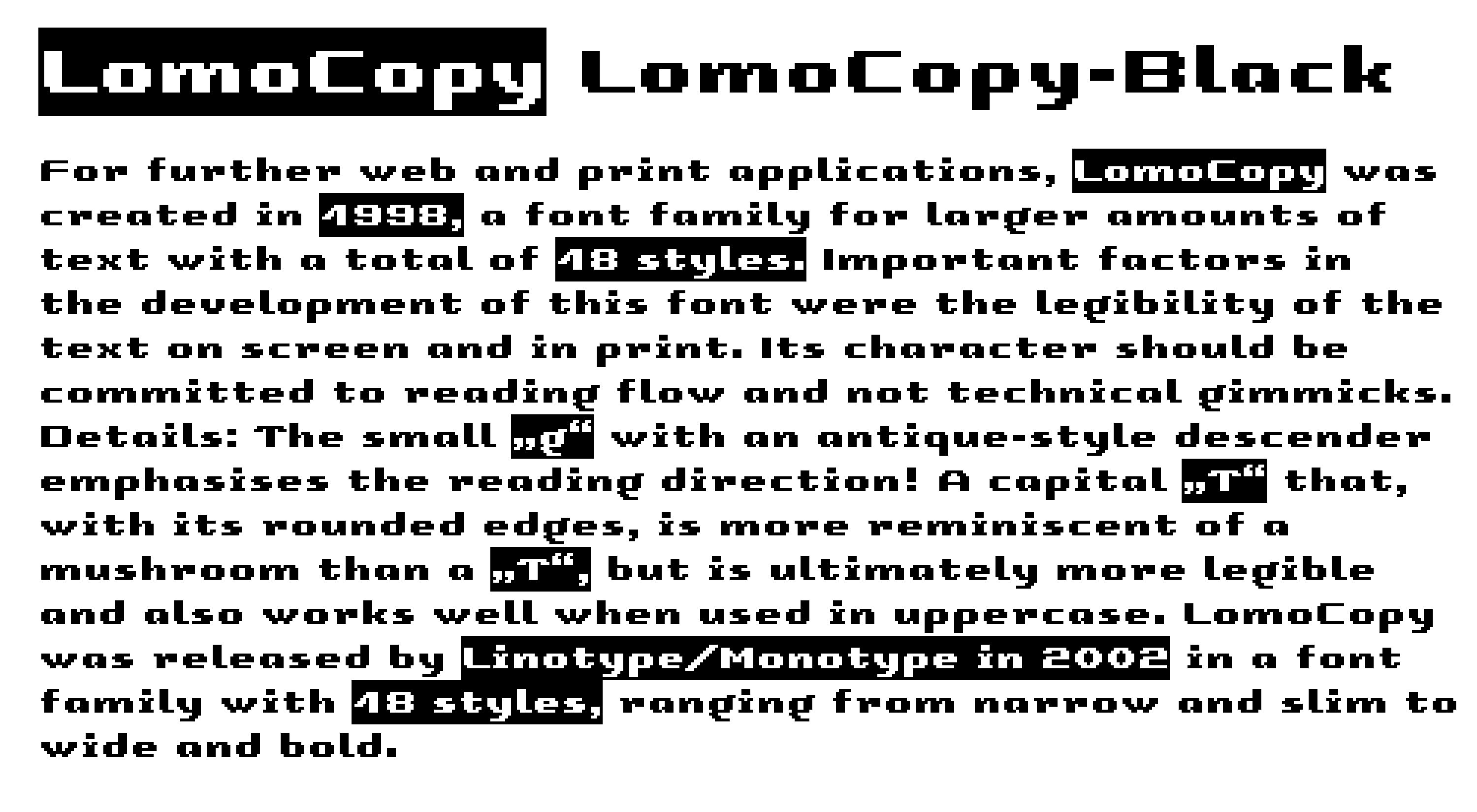For further web and print applications, LomoCopy was created in 1998, a font family for larger amounts of text with a total of 18 styles.