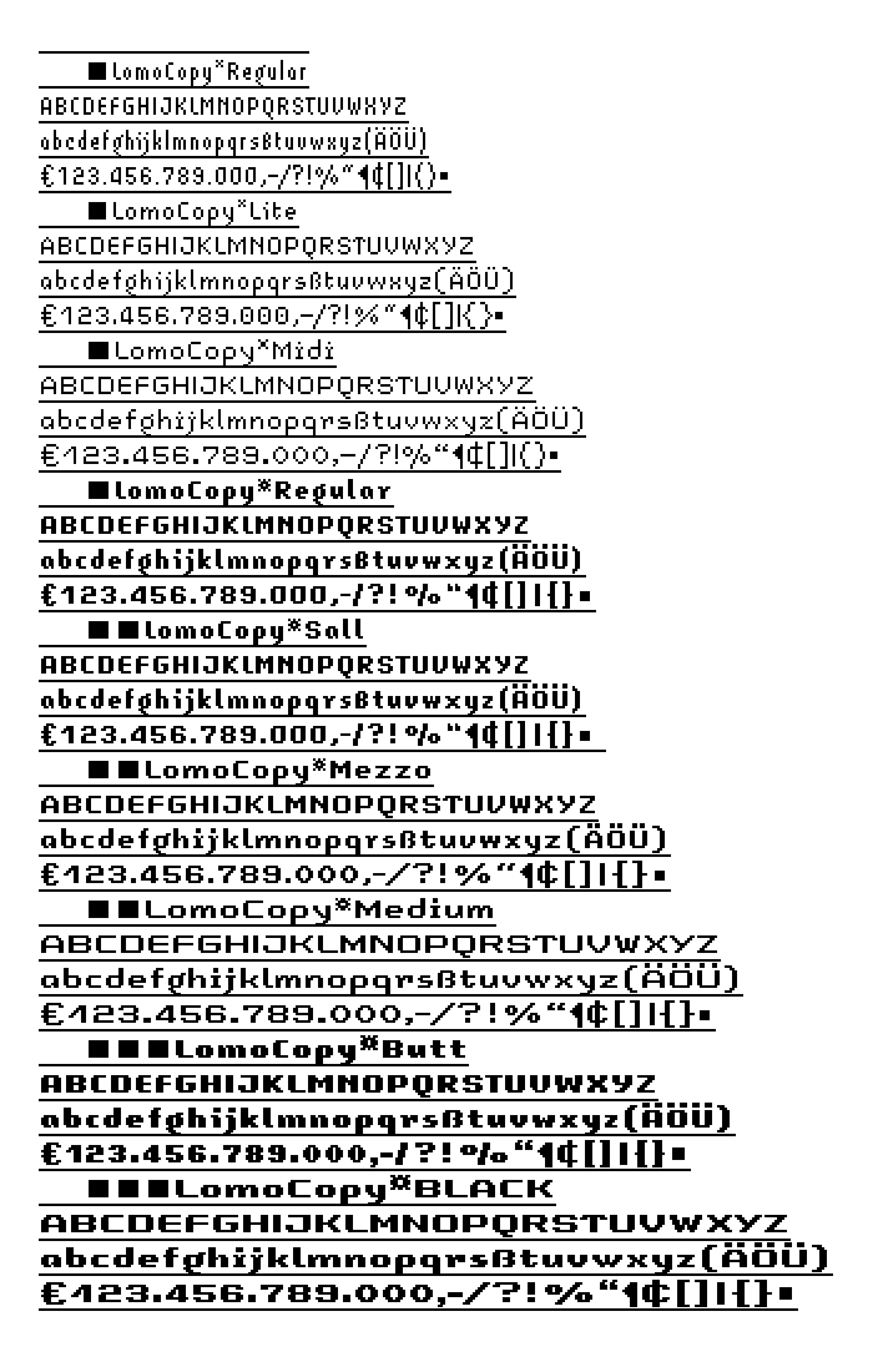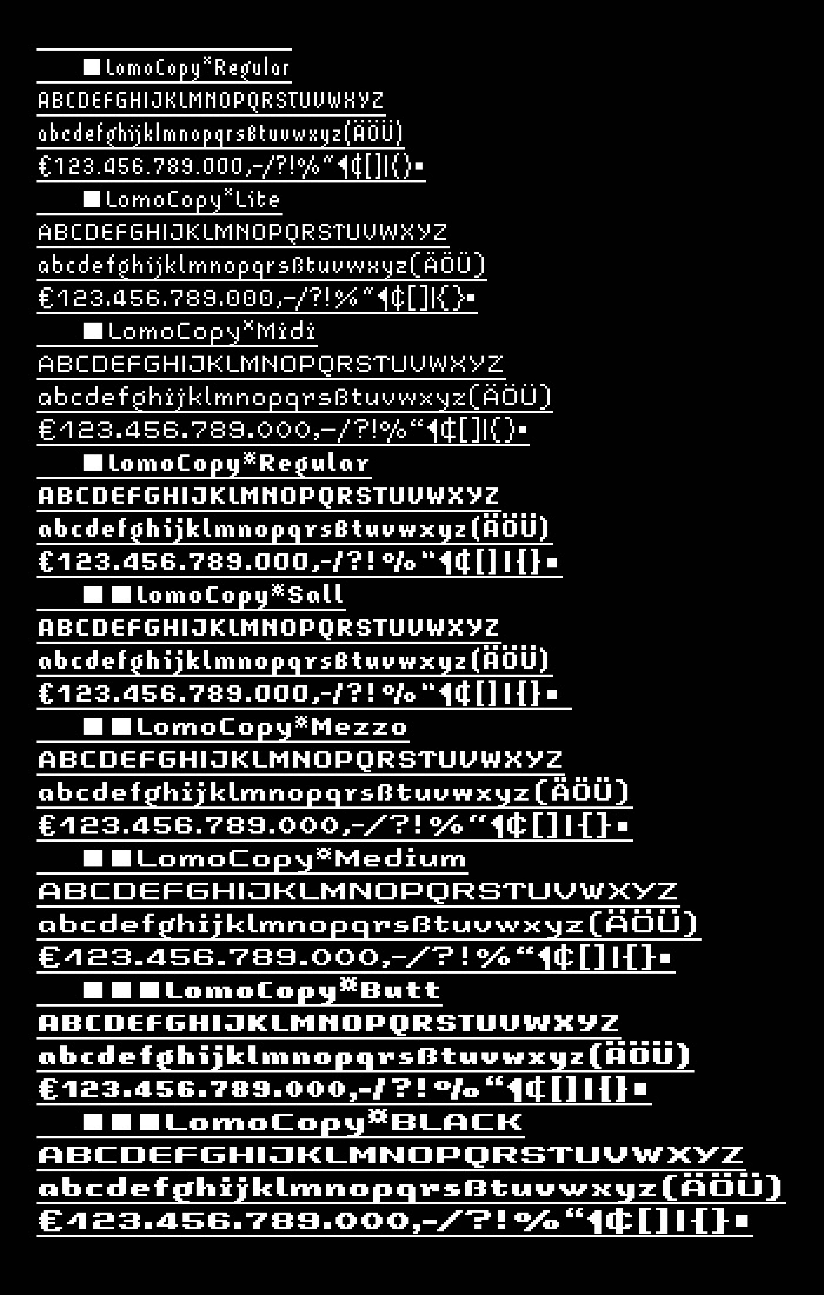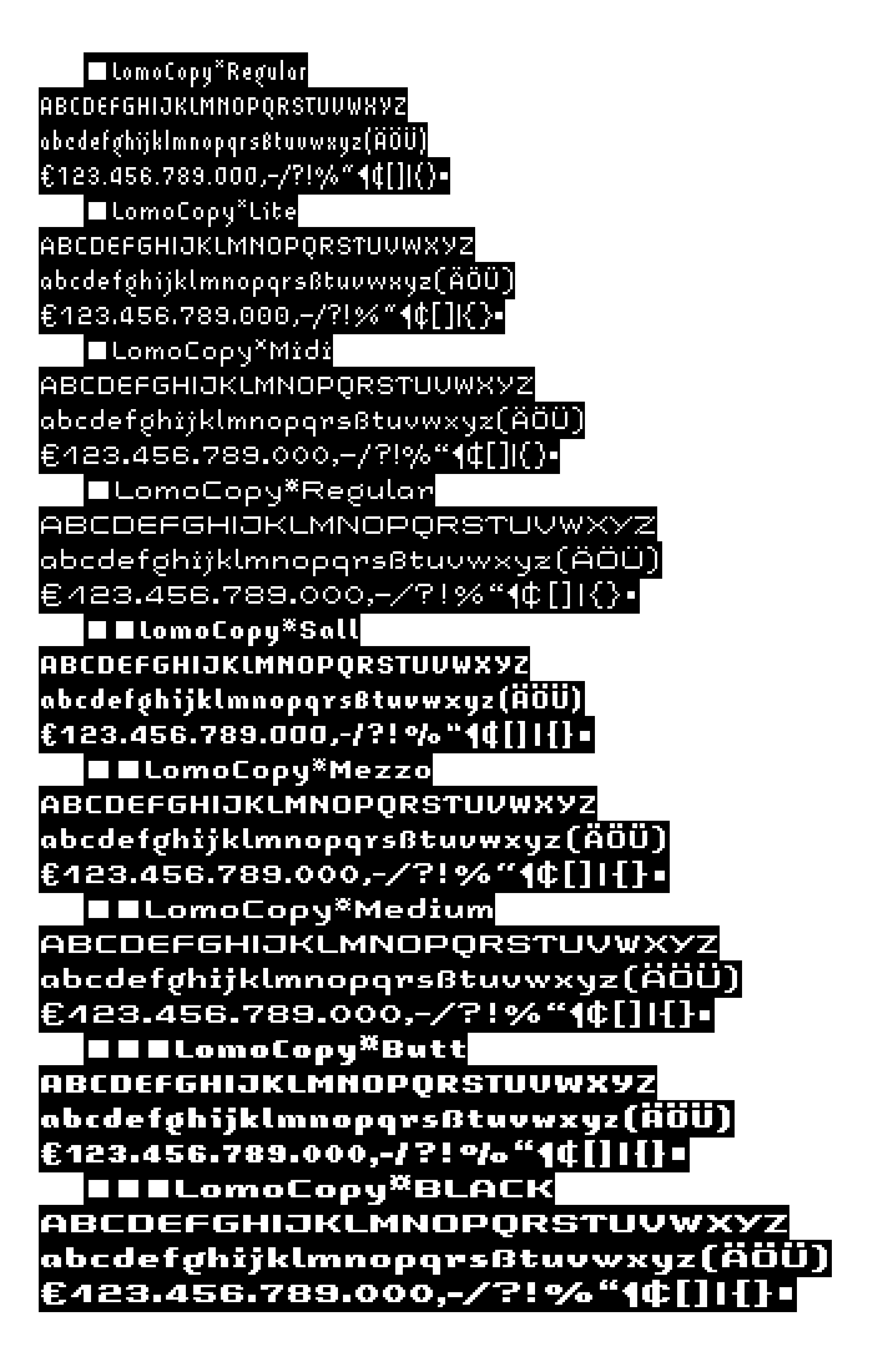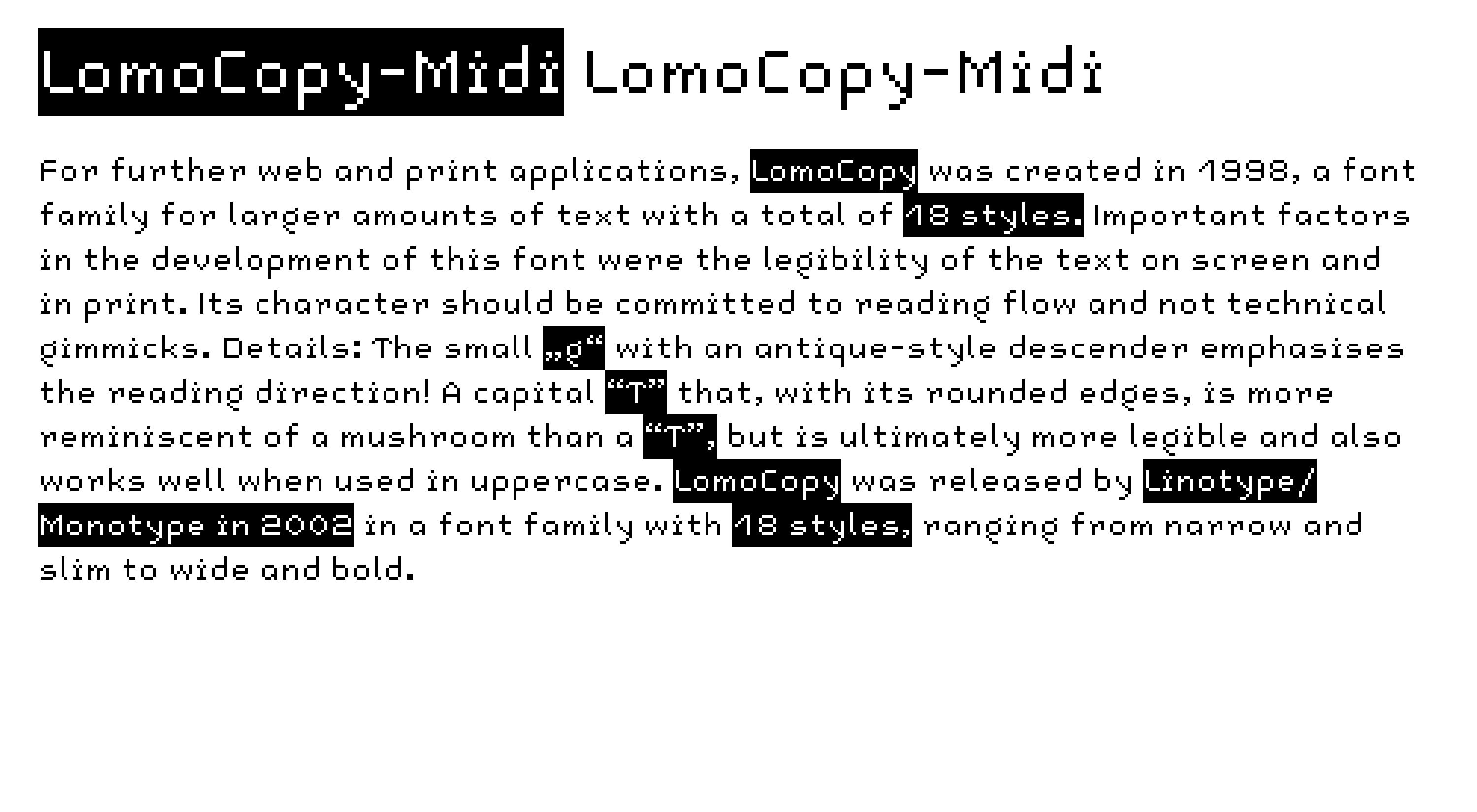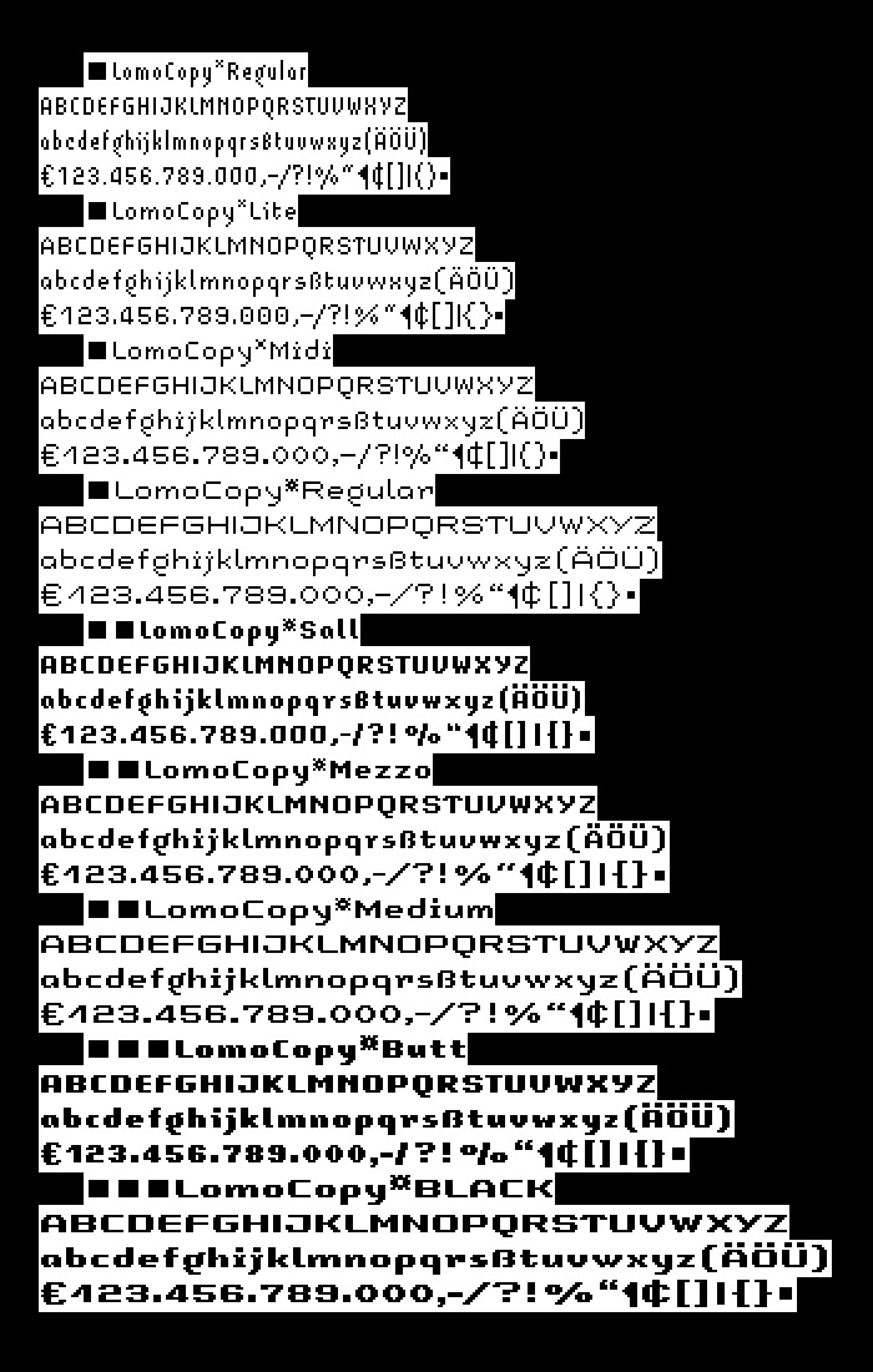 For further web and print applications, LomoCopy was created in 1998, a font family for larger amounts of text with a total of 18 styles.