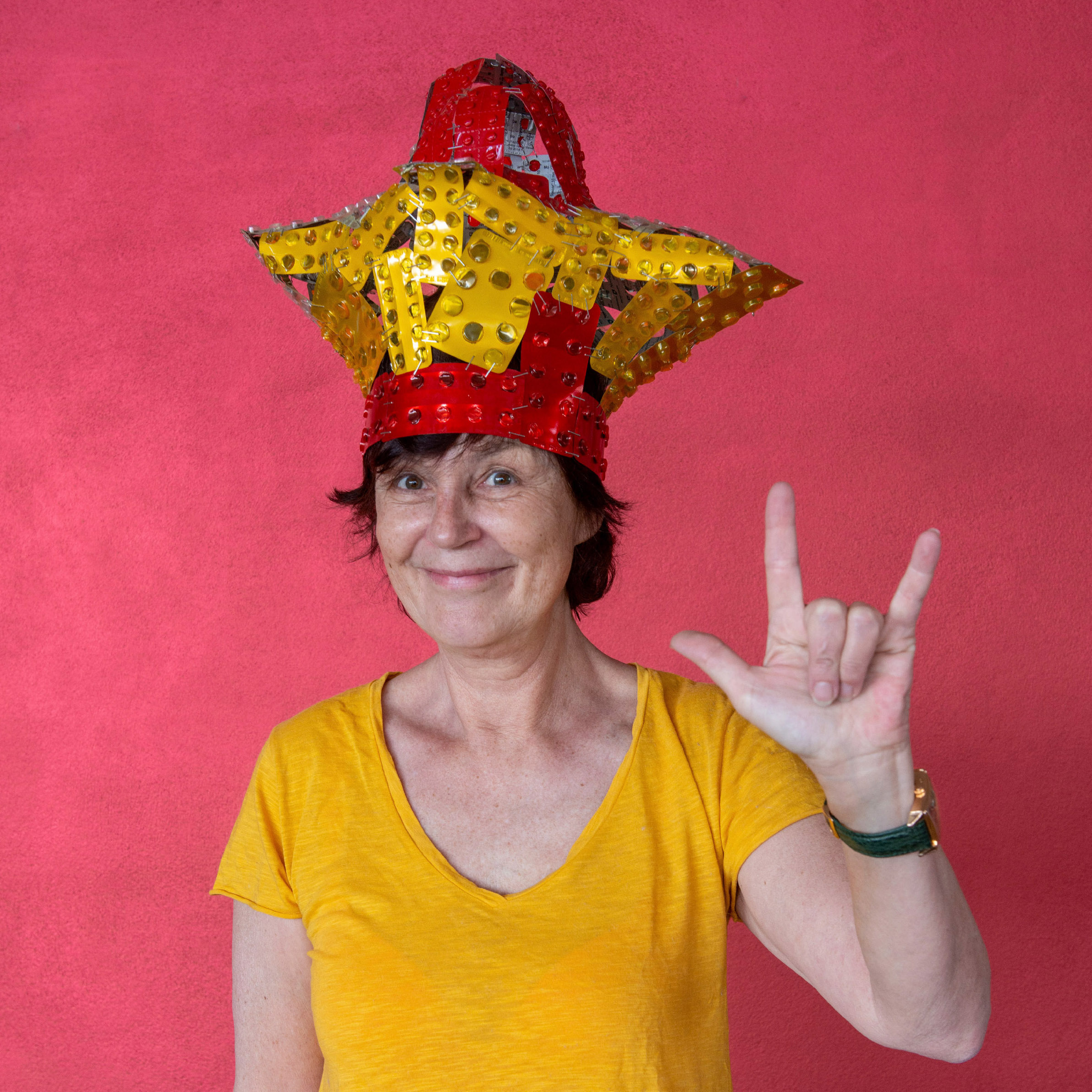 Karin Simnonitsch, owner of the MARIEN APOTHEKE in Vienna, shows the sign language gesture for ‘I love you’ with her SISTER BLISTER crown.