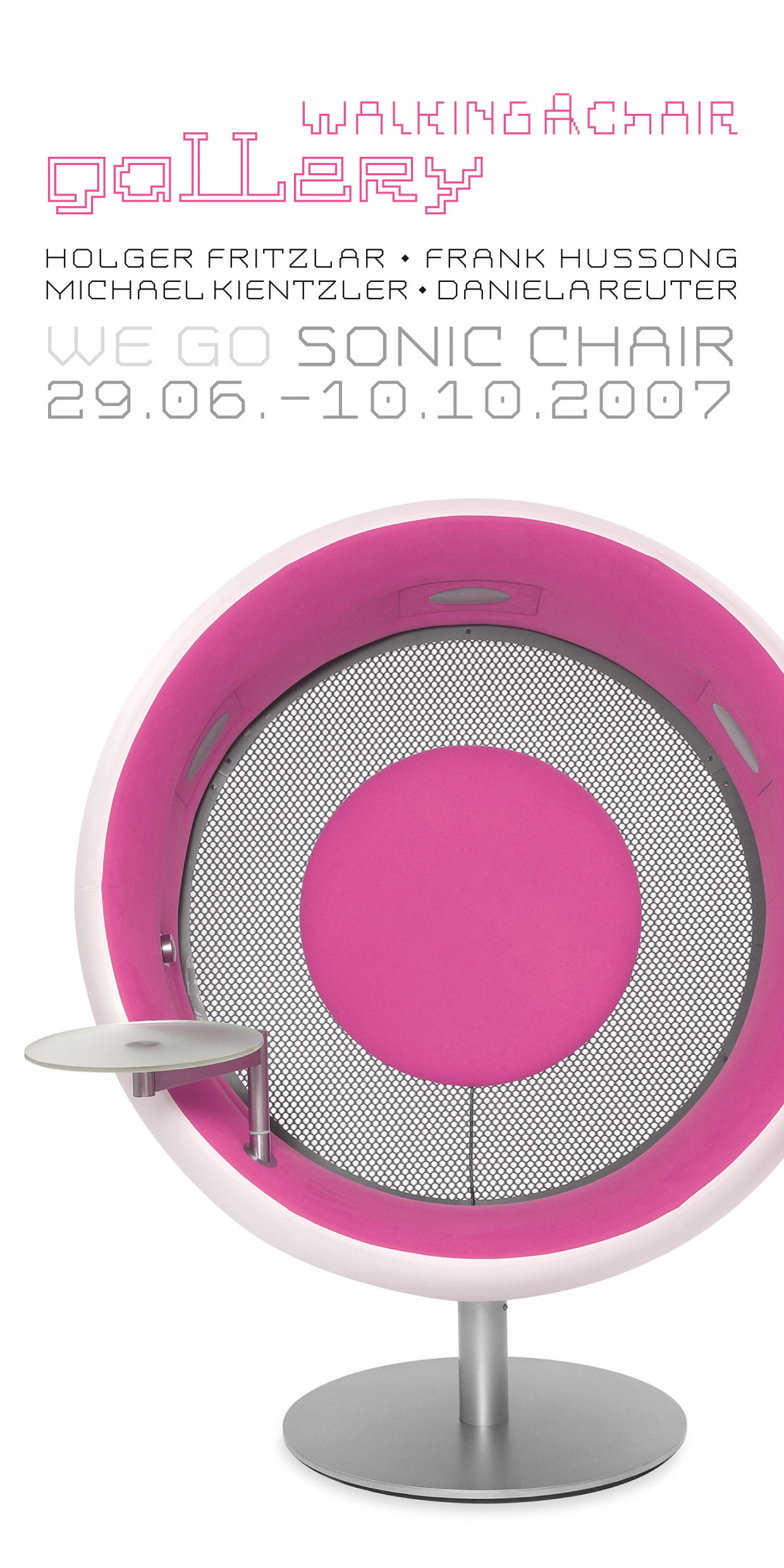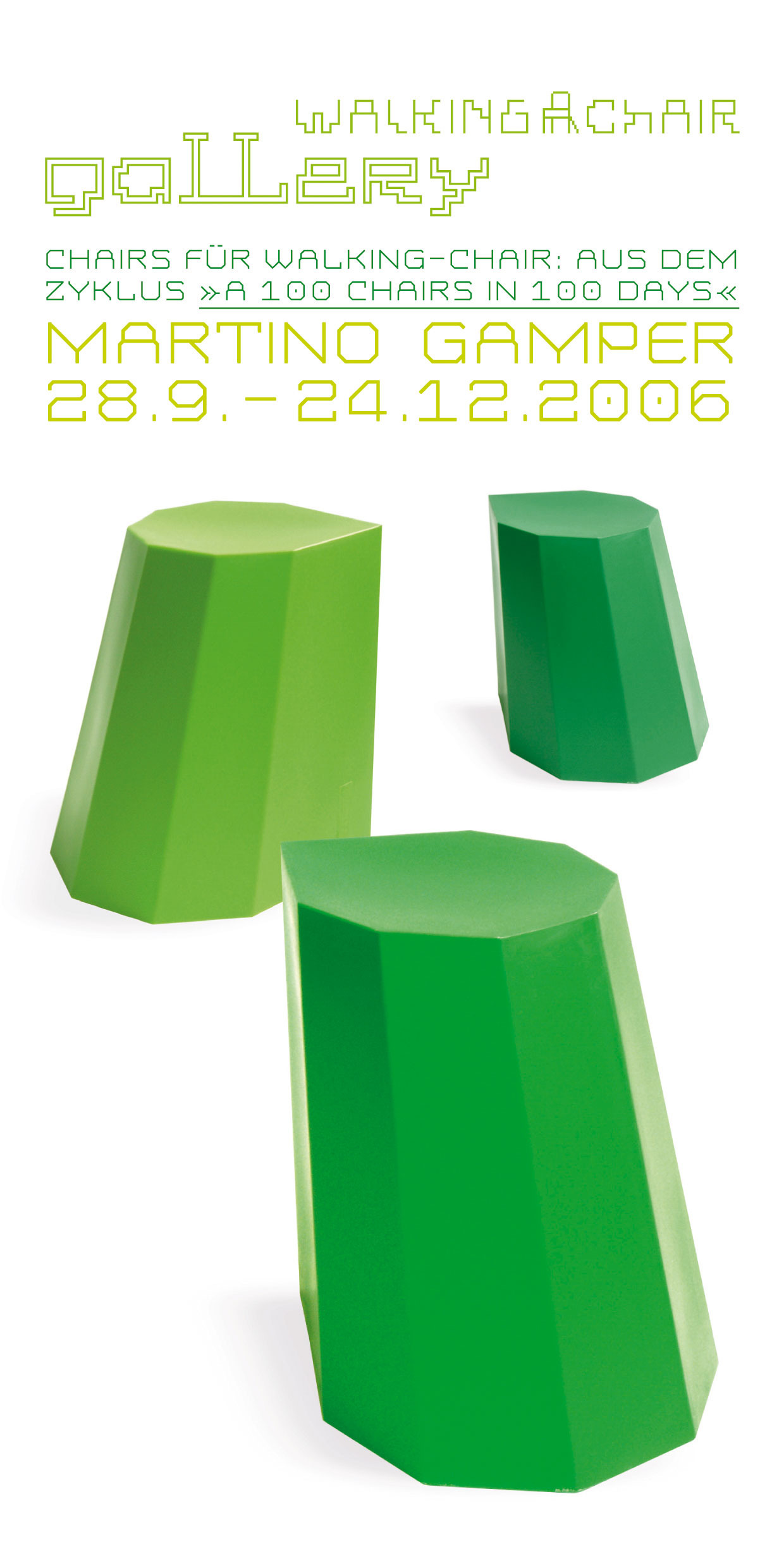Walking Chair Gallery 2006–2014 We love design: our own and that of others. From 2006 to 2014, WALKING CHAIR presented forward-looking designs by international designers at the WALKING CHAIR GALLERY in Vienna.Project: WALKING CHAIR DesignDisciplines: Exhibition curation, graphics