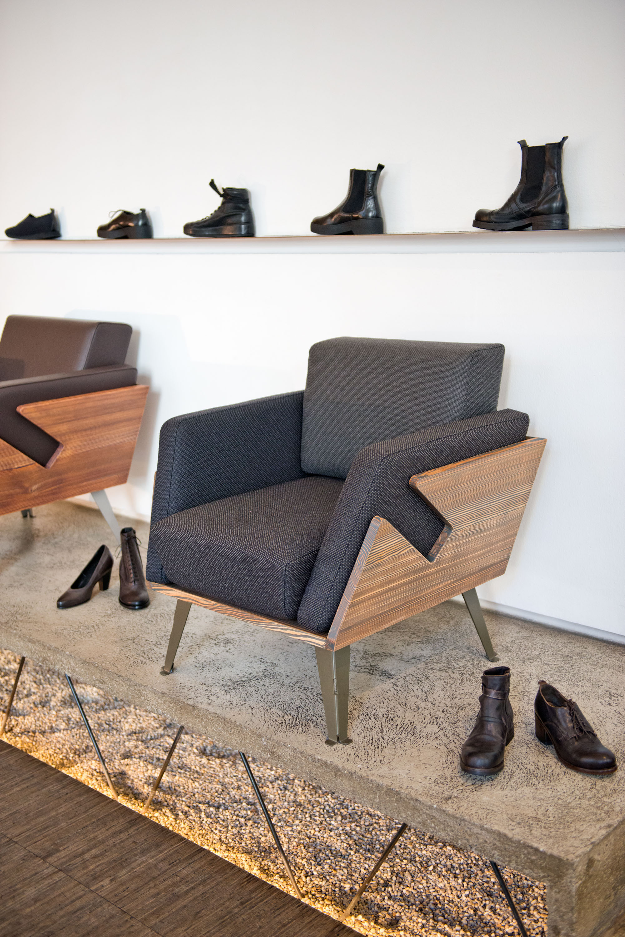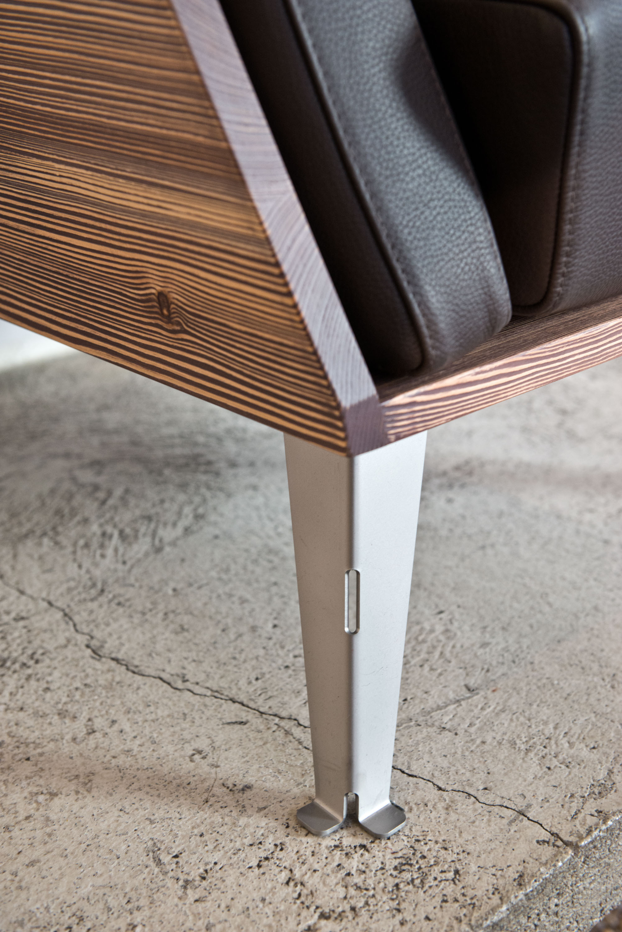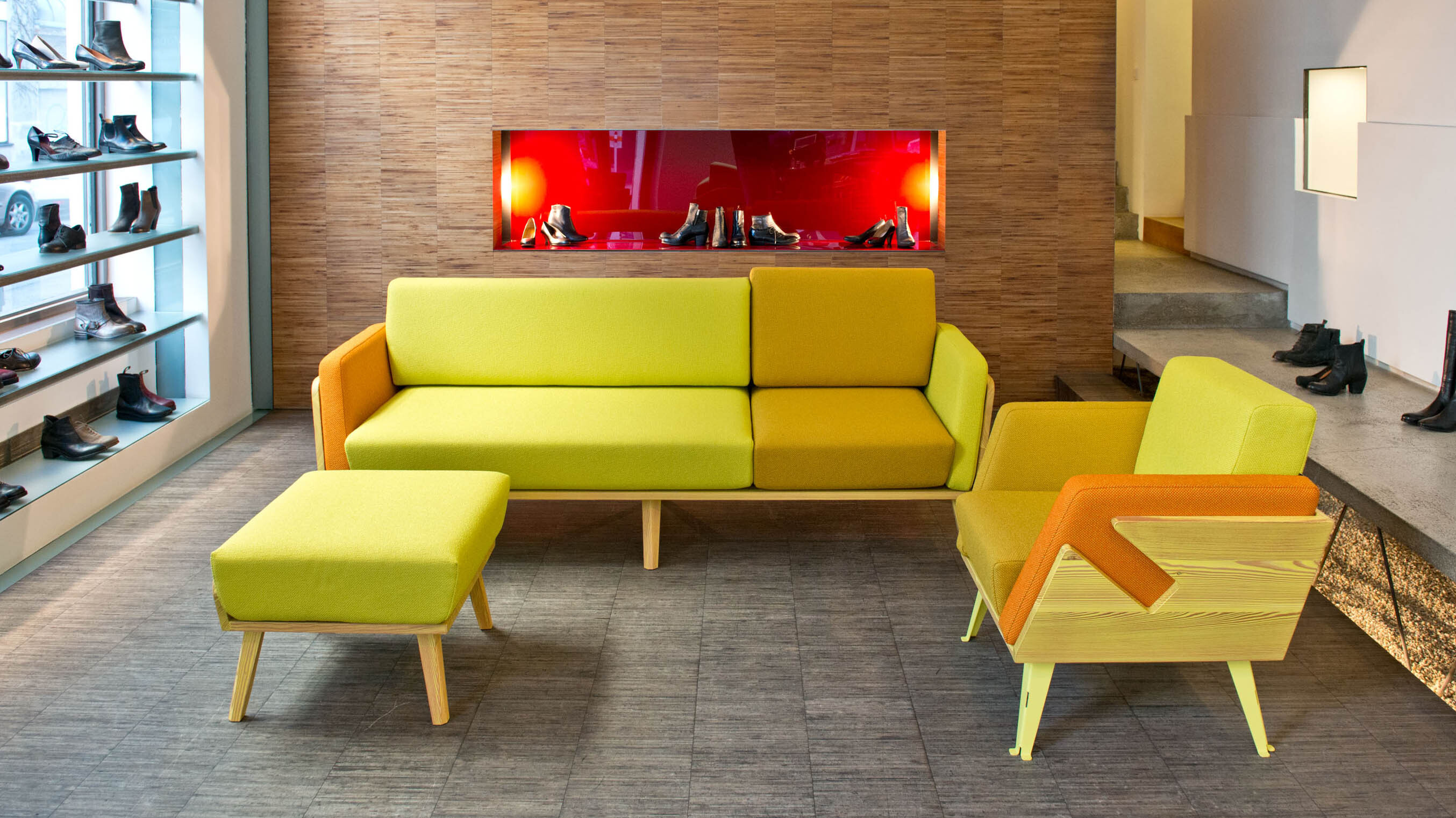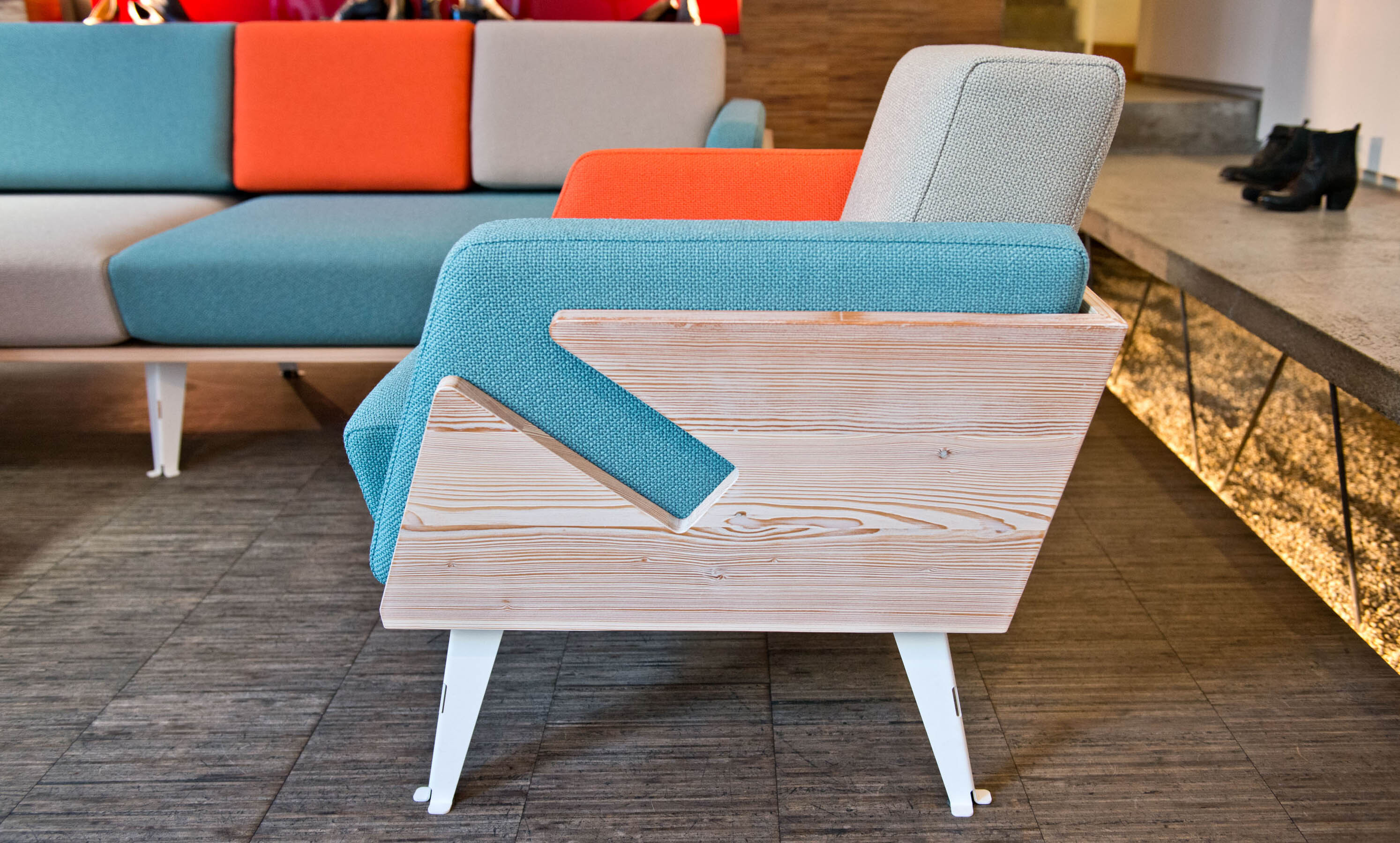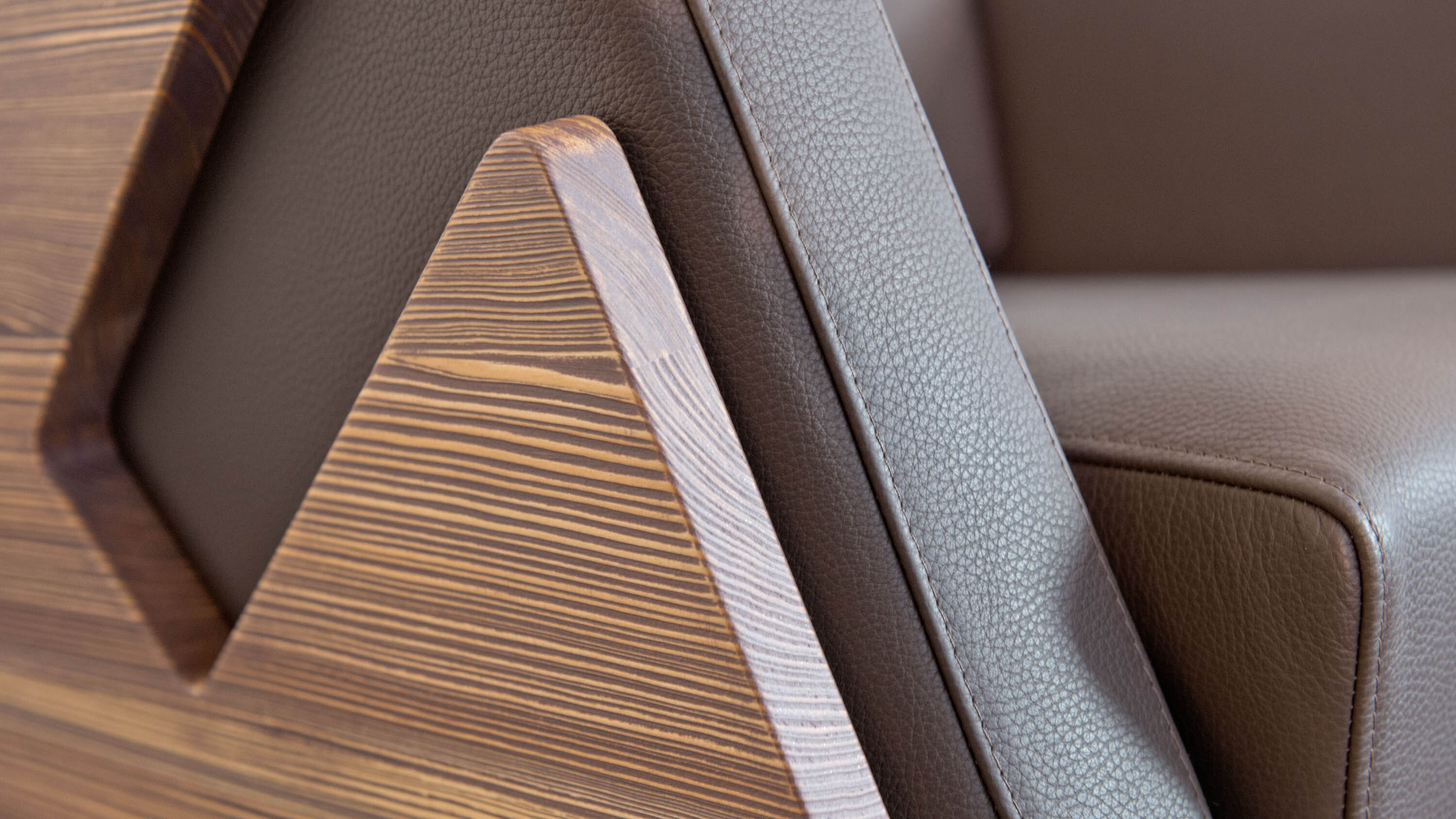 GARNITUR a new range of upholstered furniture for private and public living spaces, crafted from solid larch wood with leather or fabric upholstery. The entire furniture range comprises armchairs and various sofas.