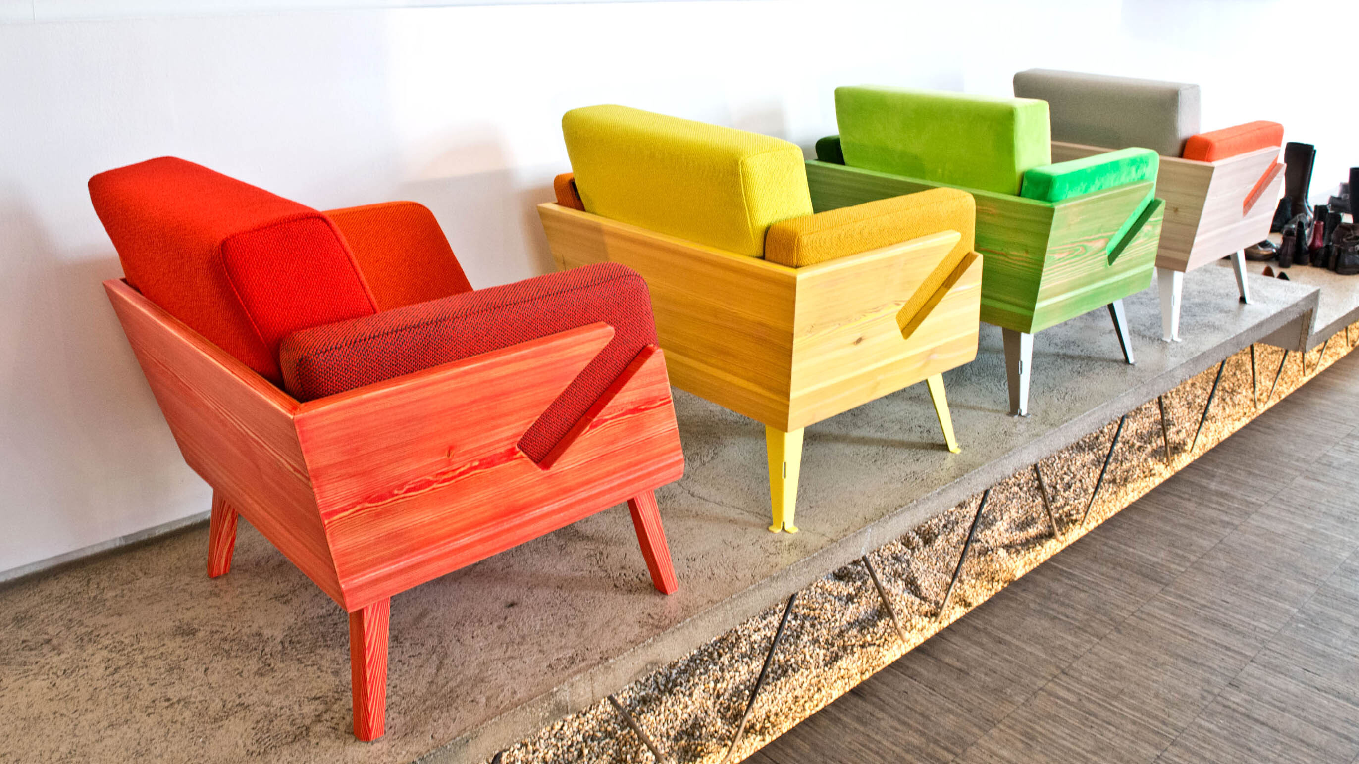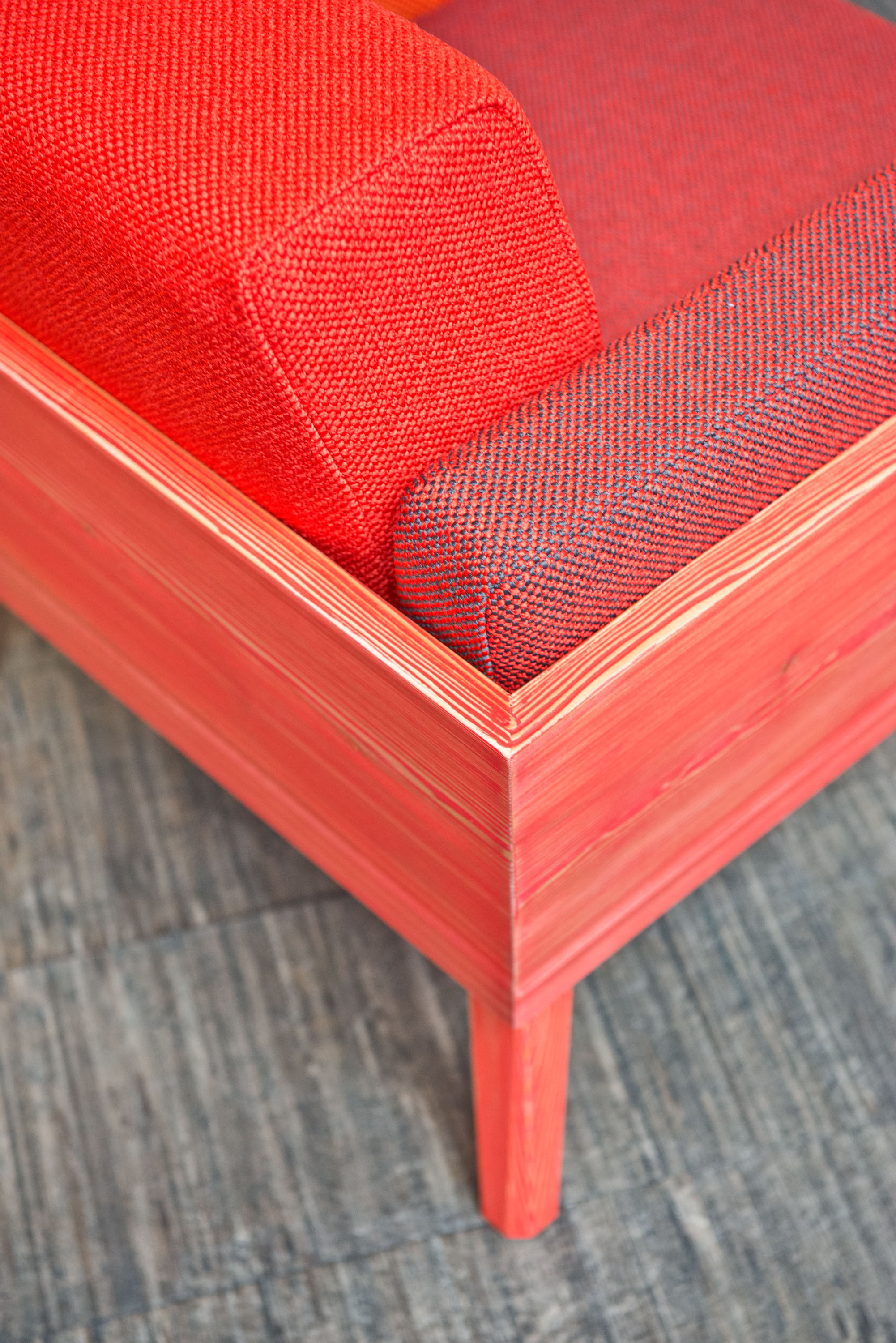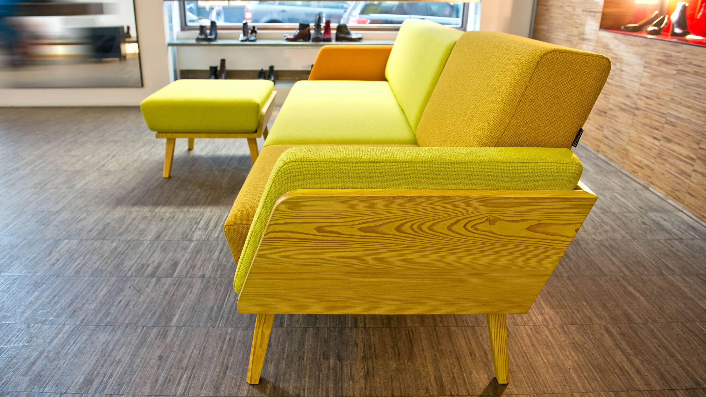 It offers a wide range of colour options. Both the stained larch wood and the upholstery can be customised to suit any colour preference.
