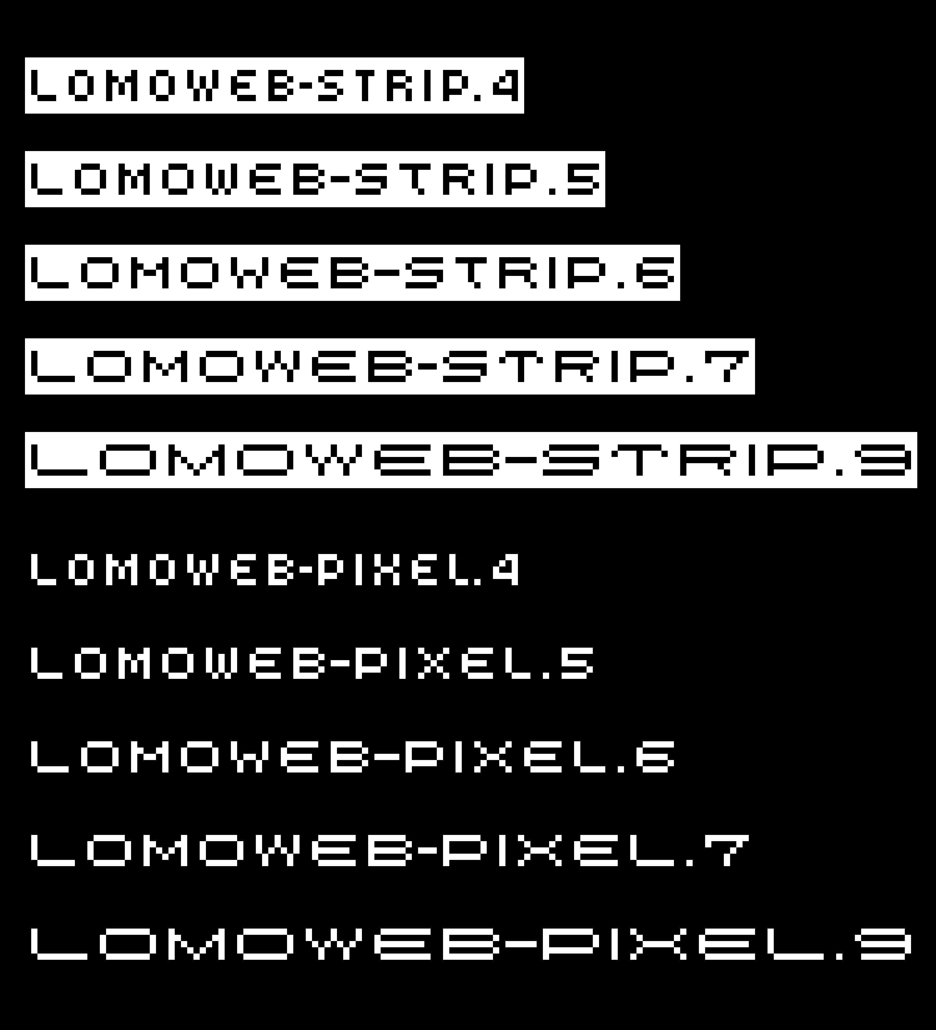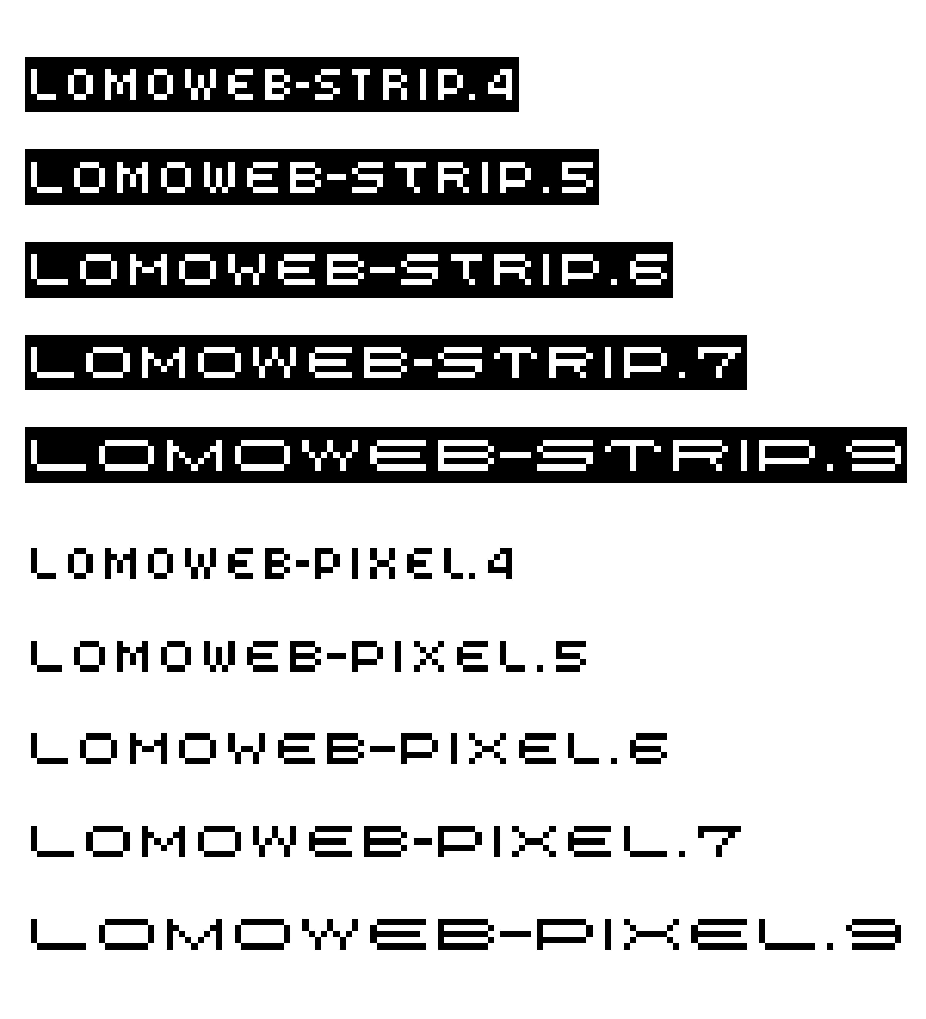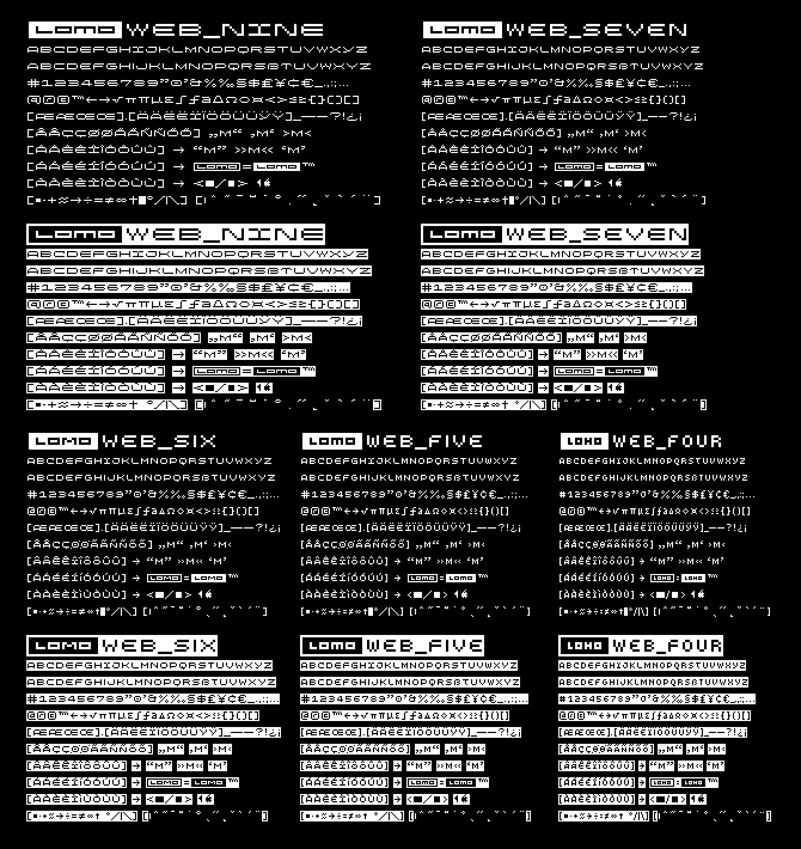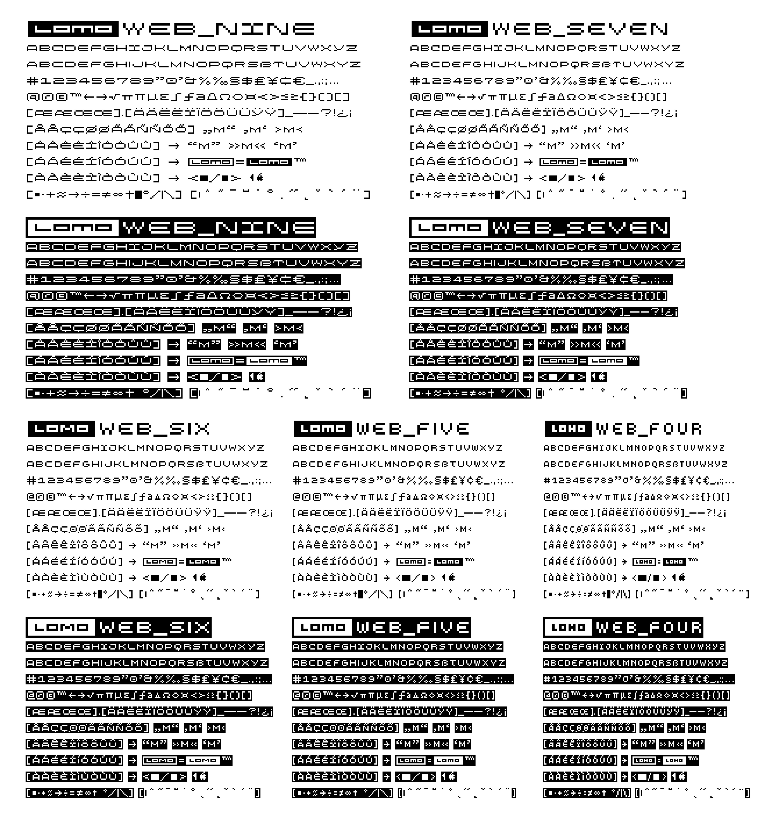 Click here to view the individual Lomo Font families: LomoWall • LomoCopy • LomoSamples • Lomo(AS)ActionSampler