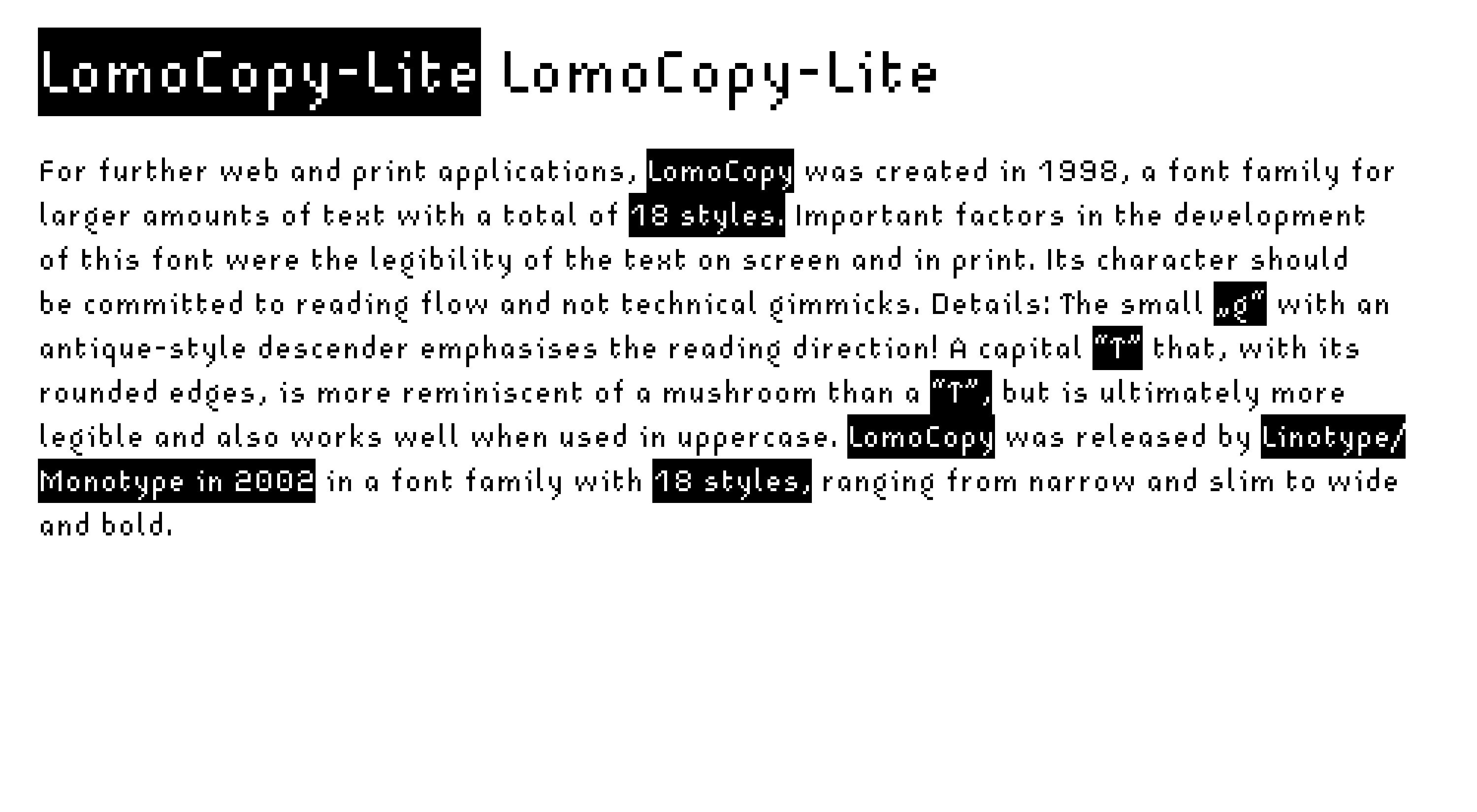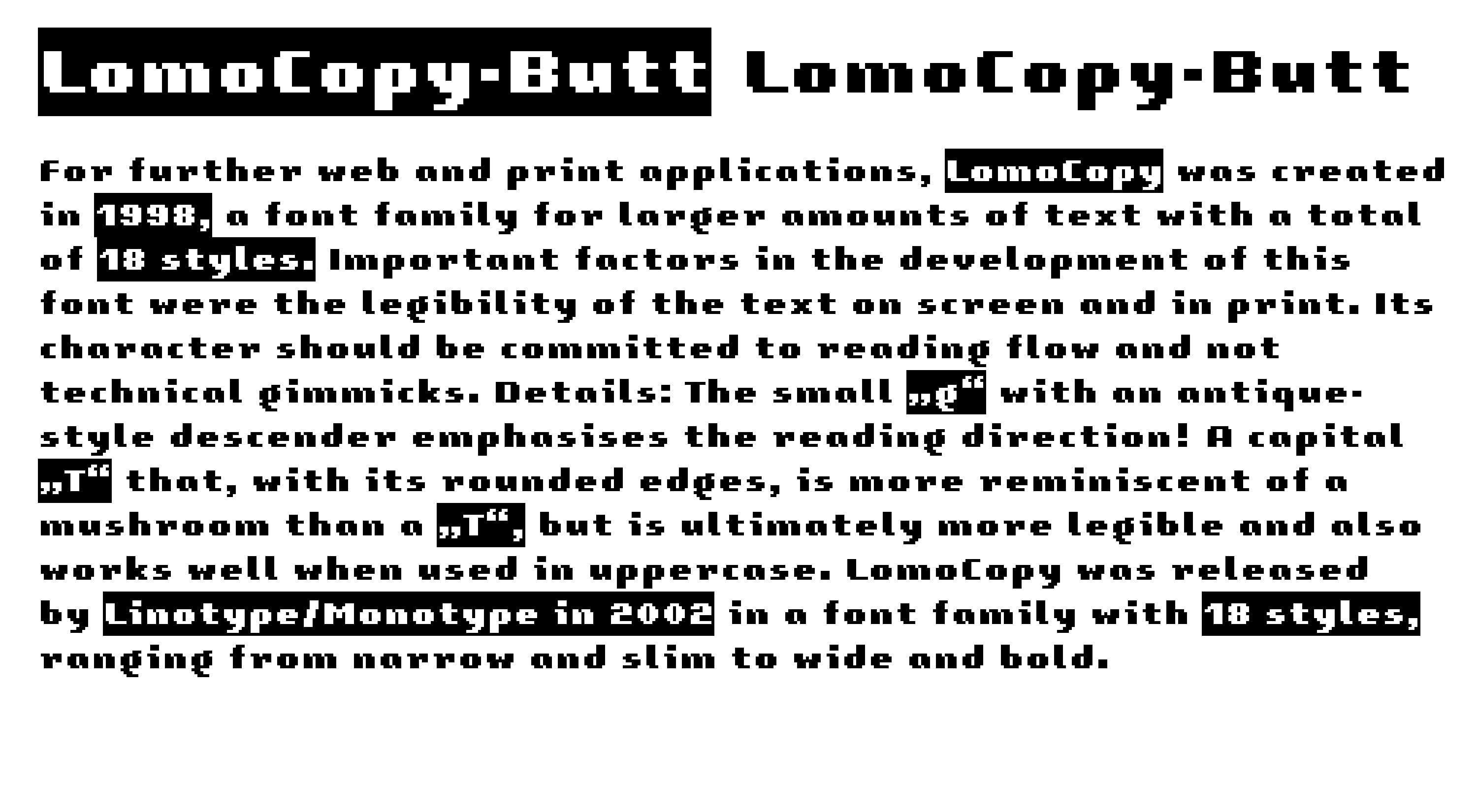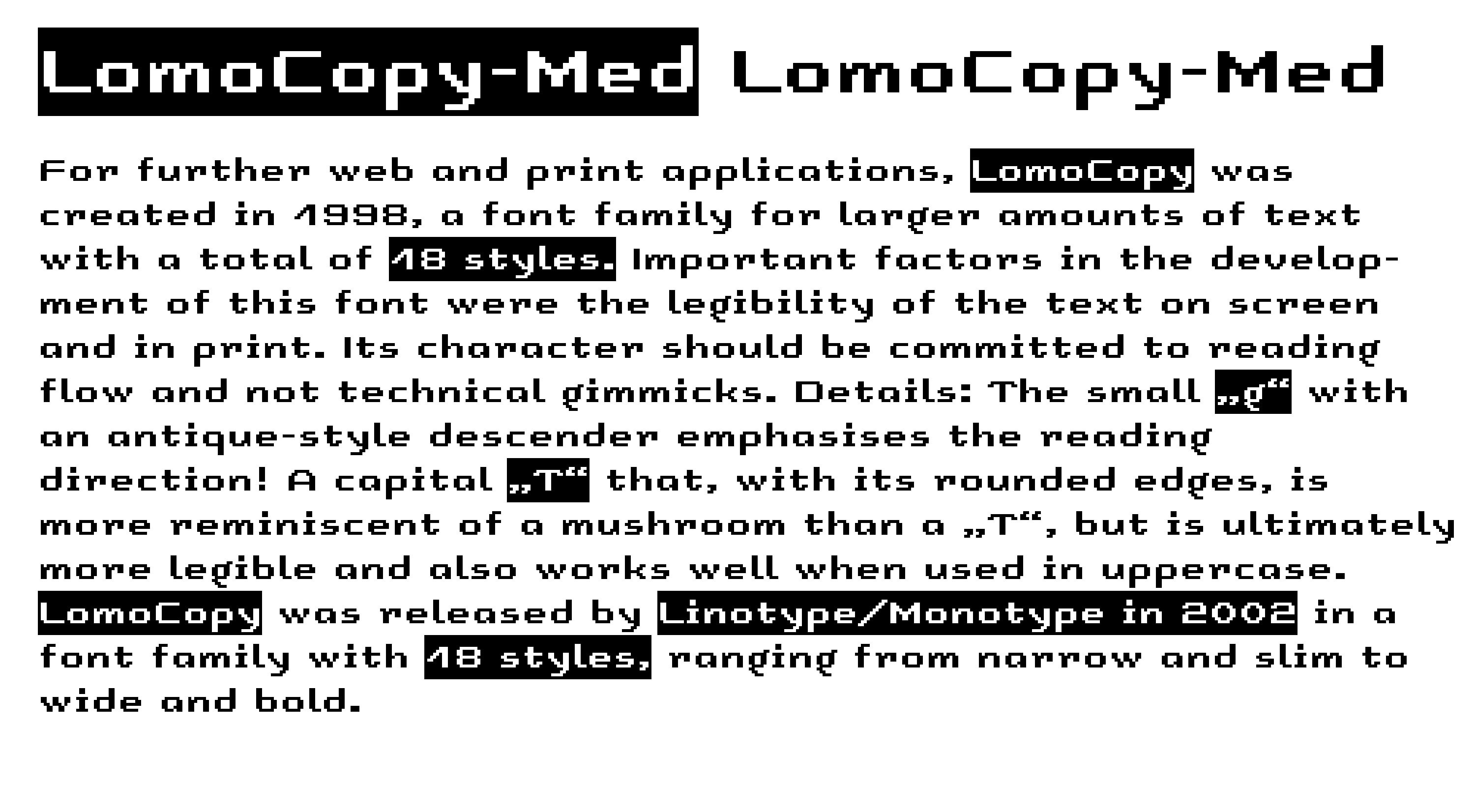 For further web and print applications, LomoCopy was created in 1998, a font family for larger amounts of text with a total of 18 styles.