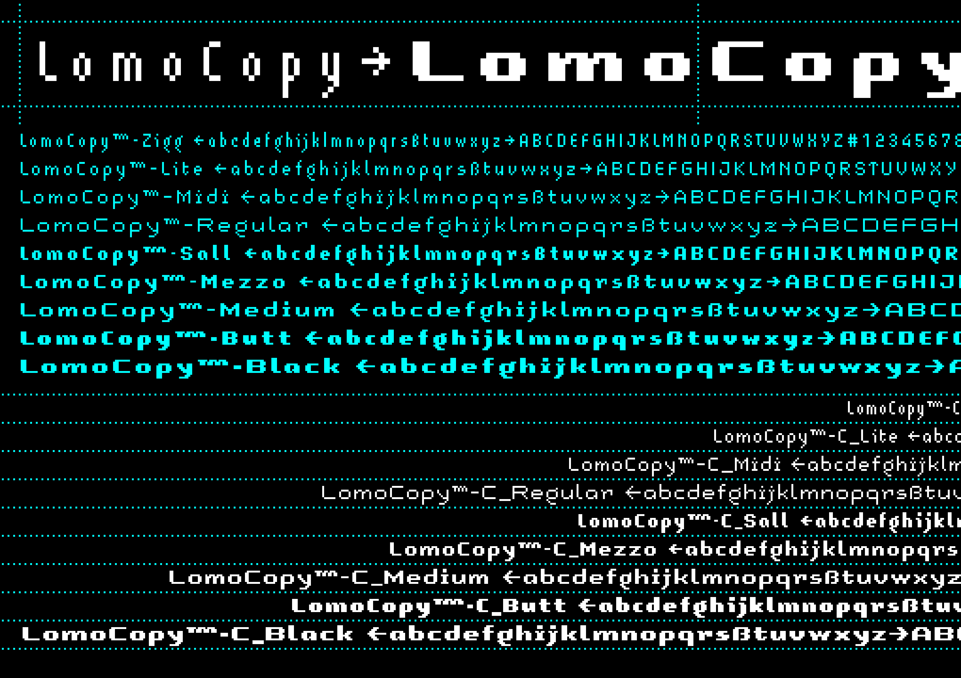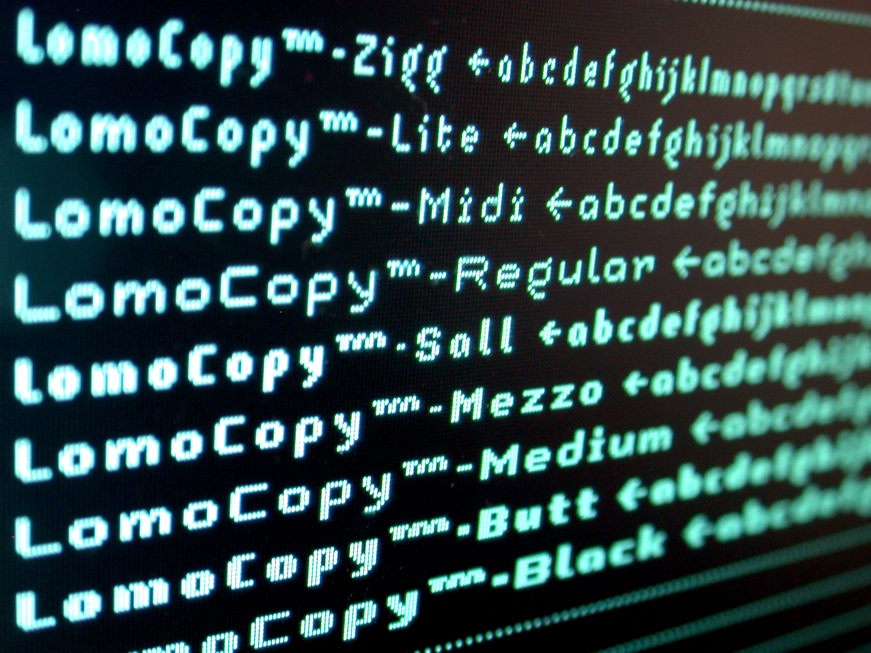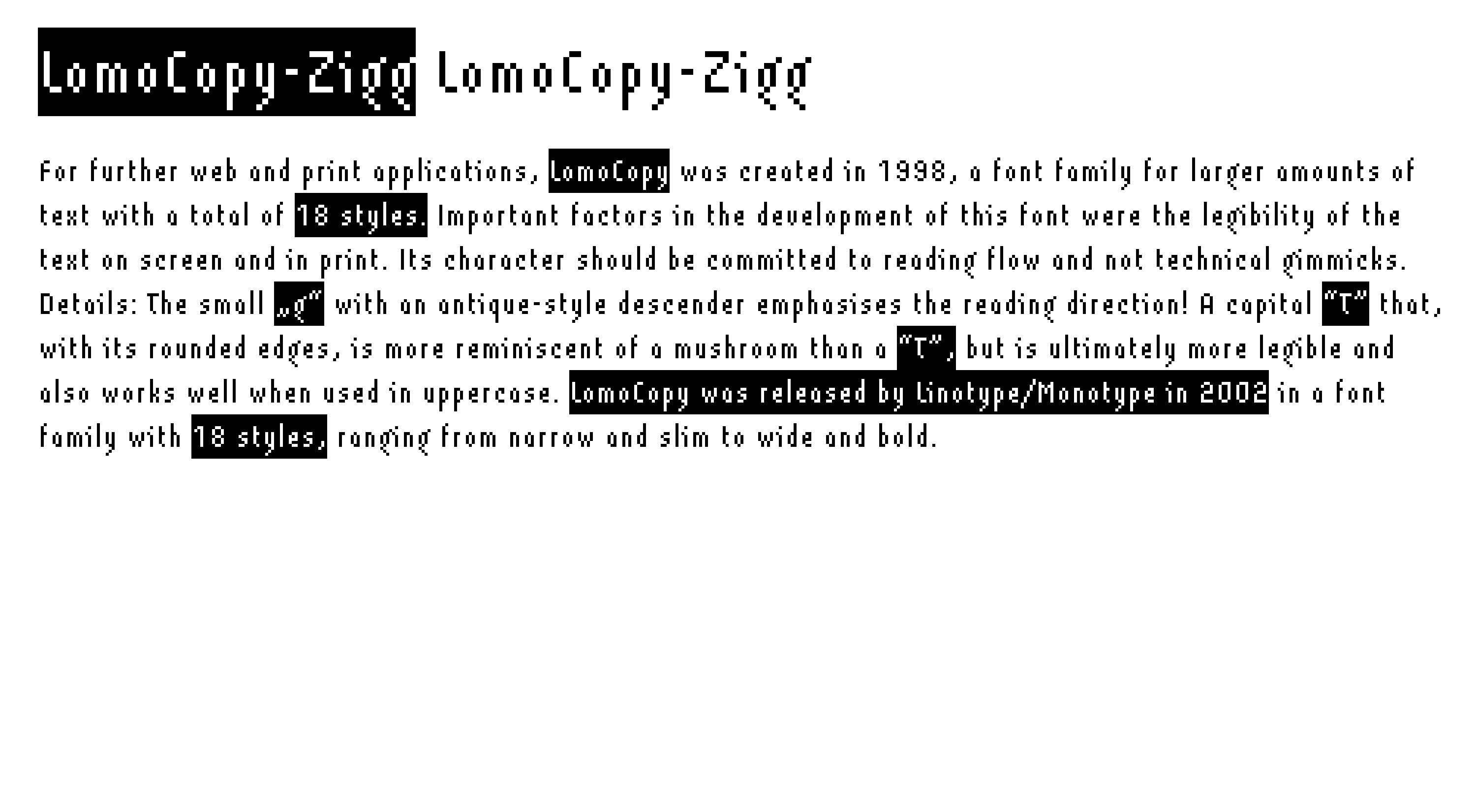 For further web and print applications, LomoCopy was created in 1998, a font family for larger amounts of text with a total of 18 styles.