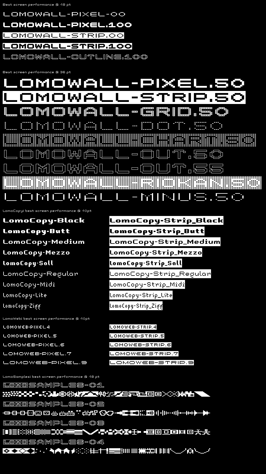 Click here to view the individual Lomo Font families: LomoWall • LomoWeb • LomoCopy • LomoSamples • Lomo(AS)ActionSampler